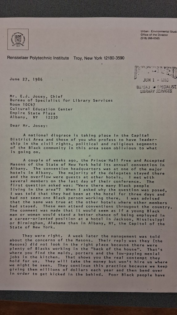 So, when I came across a 1986 letter from a Mason to the president of the Albany NAACP, it hit me hard. He criticized the organization for denouncing apartheid in South Africa while ignoring the discrimination in Albany’s own hospitality industry. Downtown hotels, he wrote, were more than happy to host the Prince Hall convention and take their tourist revenue. Yet, when the Masons looked around, they saw no Black faces among the front-of-house staff. When they asked hotel management where the Black employees were, they were told, “They are in the back.”